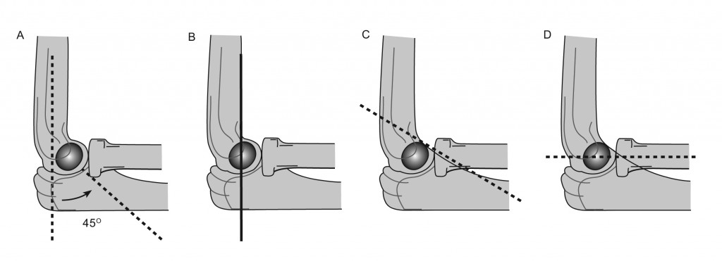 A: Normal 45 degrees anterior angulation of lateral condyle relative to humerus shaft.