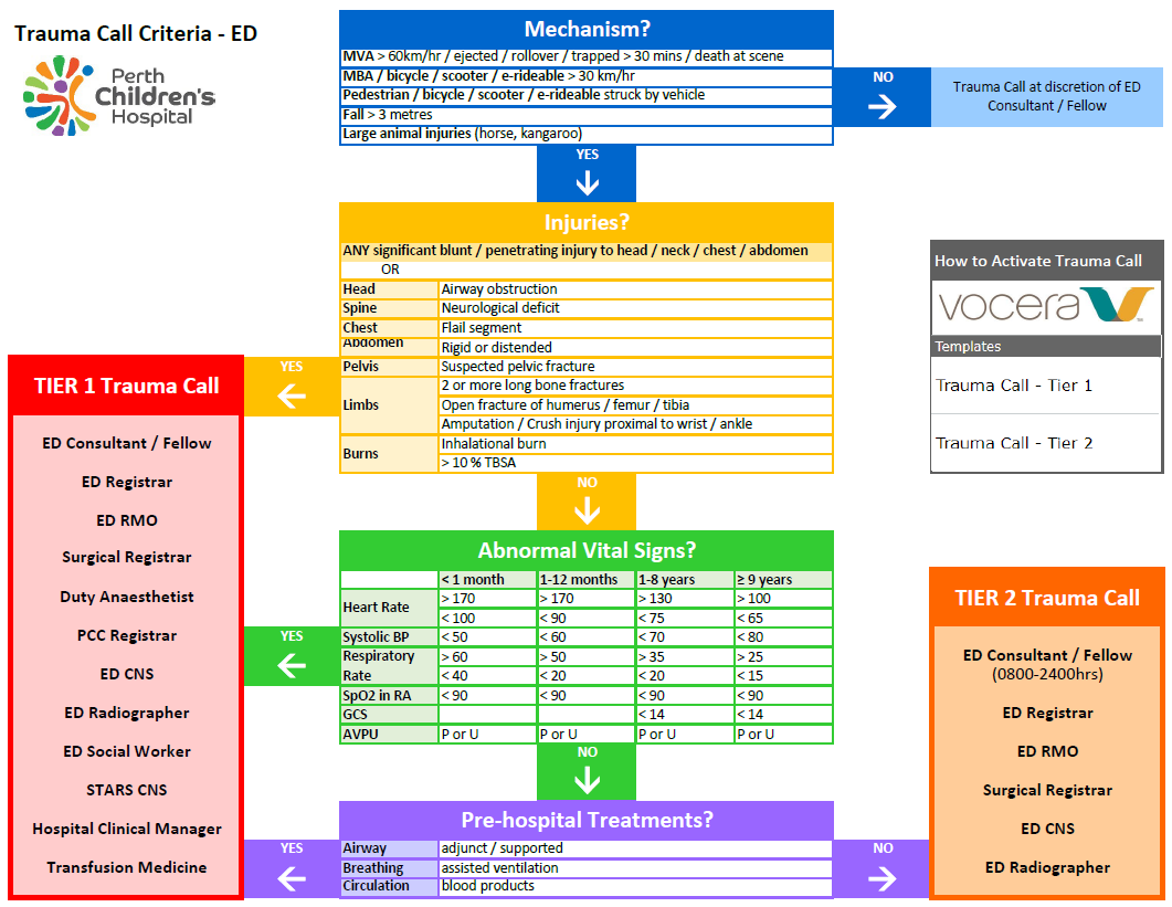 - At PCH, a two tiered trauma call system is used based on mechanism, injuries, vital signs, and treatment (see below). The trauma team will consist of staff from the Emergency Department and Paediatric Surgery, with Paediatric Critical Care Unit (PCC), and anaesthetic teams attending for Tier 1 trauma calls.