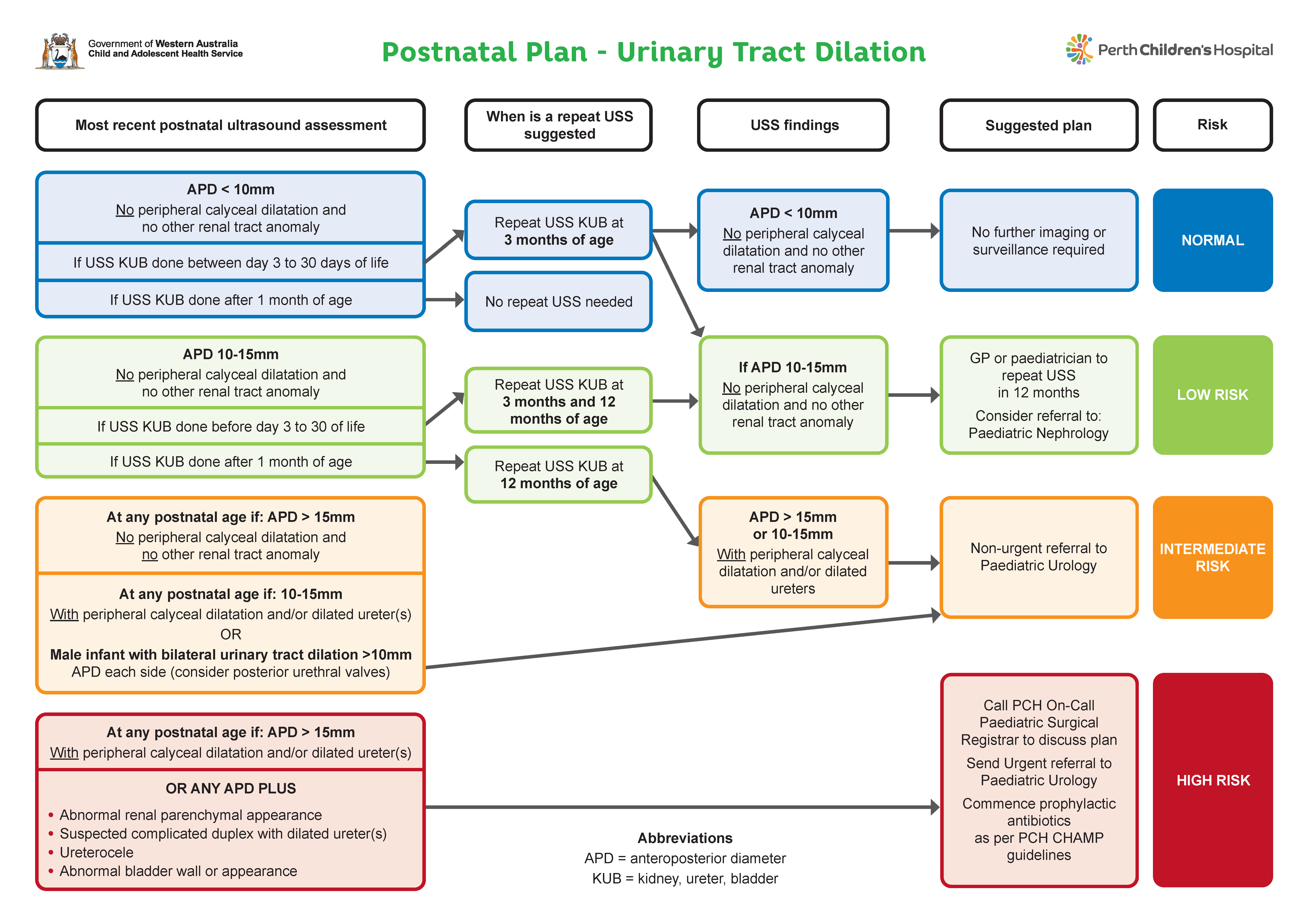 Please refer to the diagrams below outlining antenatally detected UTD and the corresponding postnatal management plan. Download the flowcharts or click the images below to view at full size.