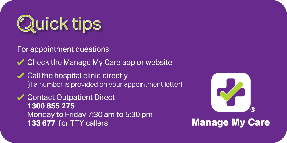 If this appointment is for a hospital listed above, then Outpatient Direct 1300 855 275 will be able to assist to answer some questions. However, please check for a phone number included within the SMS and call this number if available.