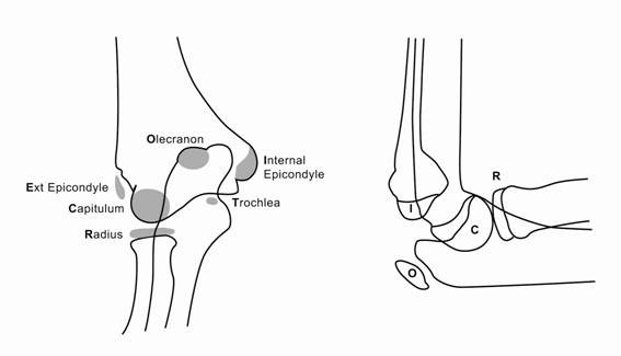 - Request an elbow X-ray (true lateral and AP views are required). This should include the distal third of the humerus and proximal third of the radius and ulna.
