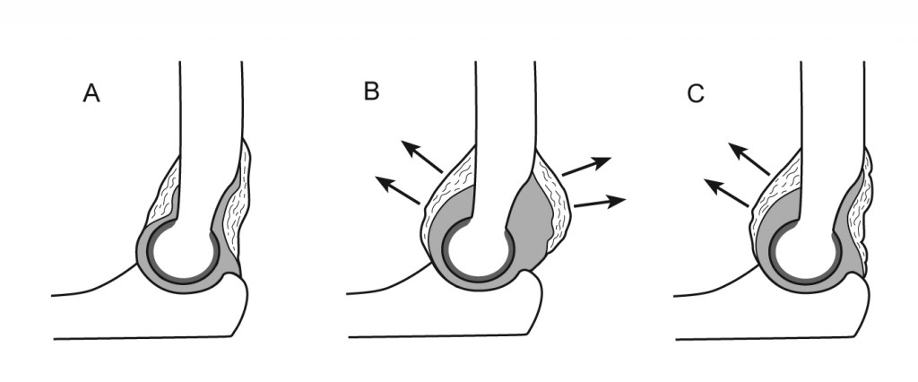 C: Intra-articular effusion displacing only the anterior fat pad (dark radiolucent area noticeably anterior to expected position).
