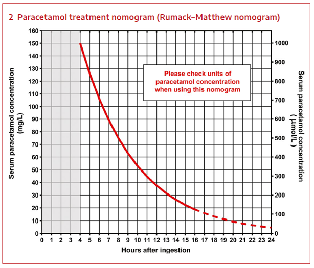 - The risk of hepatotoxicity (without treatment with acetylcysteine) can be determined by plotting the post-ingestion paracetamol level on the nomogram below.