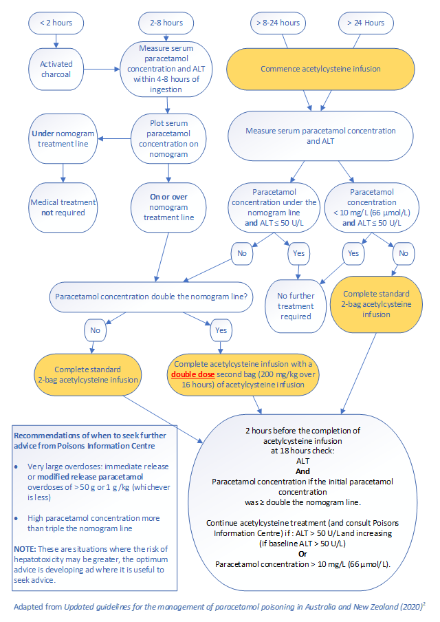 - Chiew A, Reith D, Pomerleu A, Wong A, Isosardi KZ, J Soderstrom, Buckley N. Updated guidelines for the management of paracetamol poisoning in Australia and New Zealand. Med J Aust 2019; p1-9. doi: 10.5694/mja2.50428